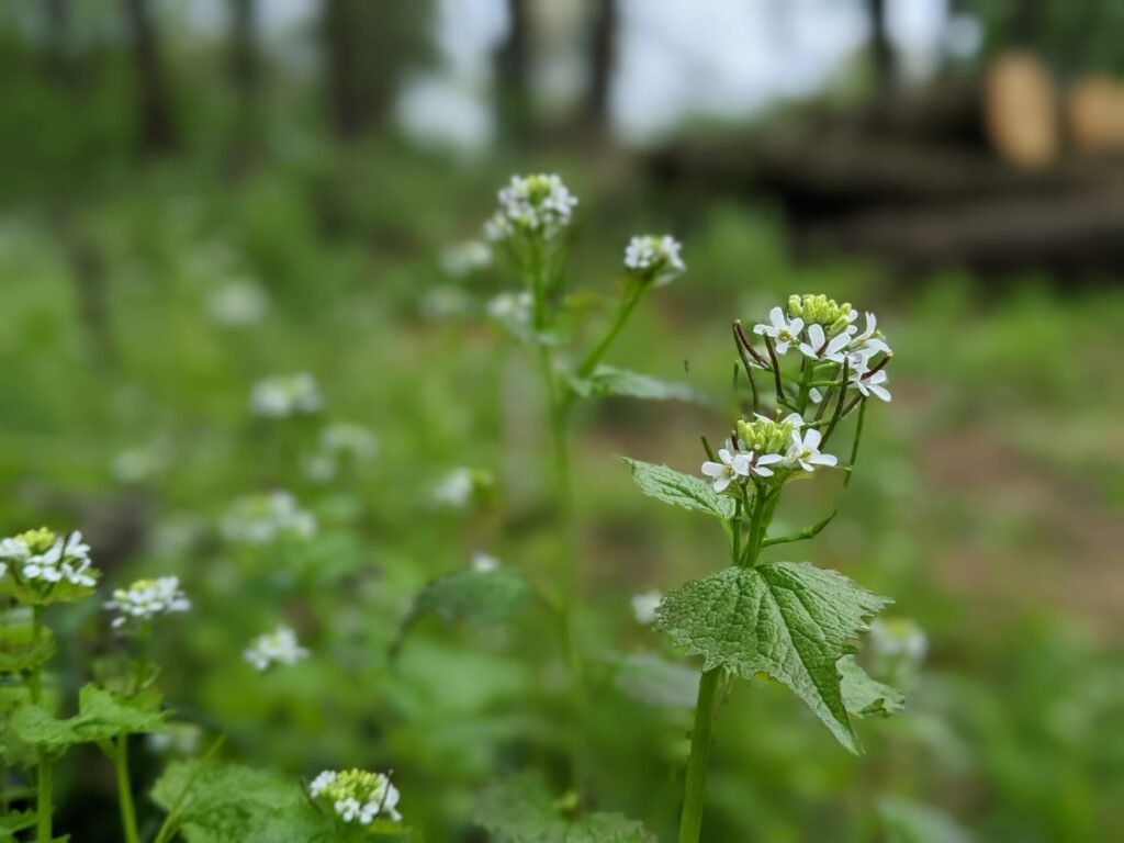 Preparing the land for future productivity involves a reduction of the invasive. It is mid-spring and the tell tale four petal white flowers hover like a magic carpet about 18 inches off the ground in all directions. Grab, twist, pull and repeat. Garlic Mustard Weed